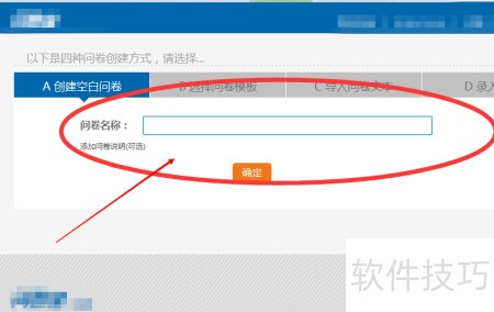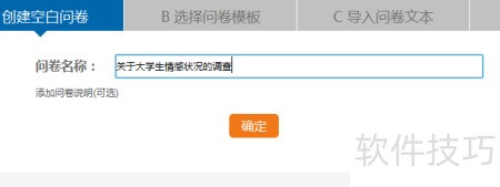 4、 在弹出页面中输入问卷标题,参考示例图片,确认无误后点击确定按钮即可完成操作。