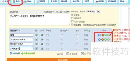 7、 若第二题为多选题,点击左上角多选按钮进入编辑界面。右侧红框标注区域可自定义调整选项顺序:↑用于上移选项,↓用于下移,+可添加新选项,-则删除当前选项,操作灵活便捷,满足不同排版需求。