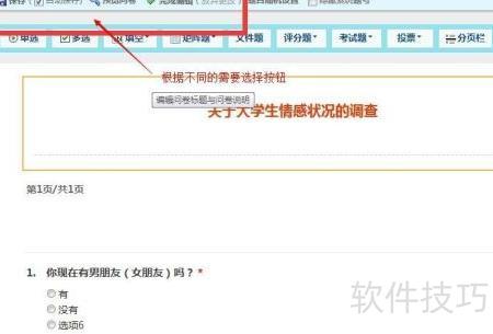 6、 例如,第一题为多选题,点击页面顶部的单选按钮后进入编辑界面。在题目标题栏中输入你要设置的问题内容,在题目选项区域逐一填写备选答案。若选项数量不足,可点击下方新增选项按钮,系统会自动添加一个空白选项,及时补全即可。完成后,点击底部的完成编辑按钮,第一道题目便成功设置完毕。