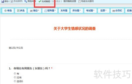 8、 问卷编辑到一半临时有事?别担心,只需点击左上角的保存按钮,内容会自动存档,随时可继续编辑。若想查看当前效果,点击预览问卷即可实时浏览。完成全部内容后,直接点击完成编辑,问卷即刻生效。方便快捷,轻松管理你的问卷进度,省时又省心,操作简单流畅,助你高效完成任务。