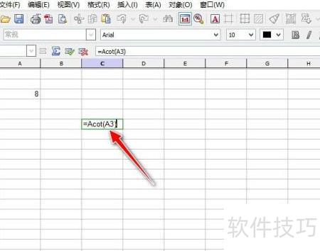 4、 在C6单元格输入=Acot(A3),用于计算A3单元格数值的反余切值。