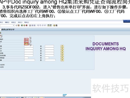 3、 进入事务代码ZSDF002,打开销售出库单打印界面。依次选择:①销售组织中的工厂代码WF00,②装运点为WF00,③工厂代码WF00,确认无误后,点击左上角执行按钮完成操作。
