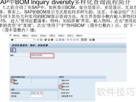 1、 在主界面的指令栏输入CS15,进入使用位置清单:物料:初始屏幕。填写所需物料,选择使用处清单的类型为直接,在使用于中选物料BOM,然后点击下一屏按钮,进入后续操作界面。整个过程参照界面提示依次进行即可完成操作流程。