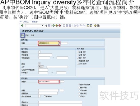 3、 进入事物代码CS20后,打开大量更改:物料选择界面,在红框标注区域输入原物料和新物料信息,勾选BOM类别中的物料BOM,并在项目更改中选择更改项目数据,最后点击蓝框所示的执行按钮完成操作。