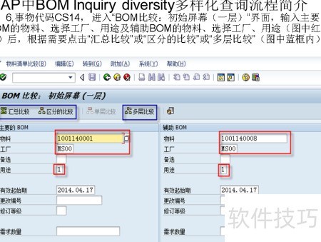 6、 进入事物代码CS14后,打开BOM比较:初始屏幕(一层)界面。在红色框选区域中,分别输入主BOM和辅助BOM的物料编号,并选择对应的工厂与用途。随后,在蓝色框选区域内,根据实际需求点击汇总比较、区分的比较或多层比较按钮,执行相应比对操作。
