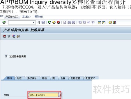 7、 输入事物代码CC04,进入产品结构浏览器初始界面,在红框所示位置输入物料编号后按回车键确认。