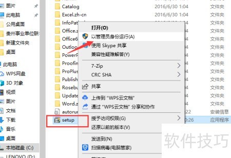2、 进入Office2007安装目录,右键点击setup文件,选择以管理员权限运行进行安装。