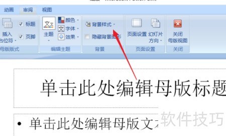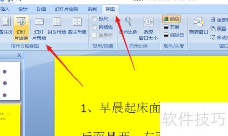 4、 可点击视图选项中的幻灯片母版来更换背景。