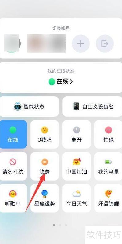 启动QQ应用,进入主界面查看当前状态为在线,点击后选择隐身模式,再次查看时状态已变为隐身。