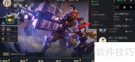 进入游戏主界面后,打开好友列表,点击在线状态选项,选择隐身模式即可隐藏自己的在线状态,详细操作步骤如下所示。
