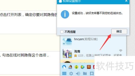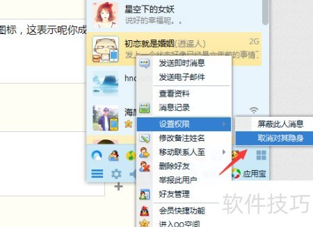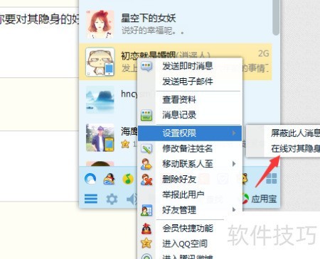 3、 右键点击好友栏,找到权限设置,勾选对其隐身即可实现在线隐身。