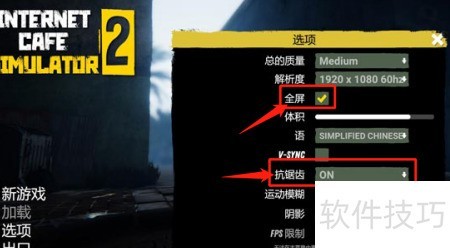2、 在菜单中开启全屏与抗锯齿,保存设置后退出。