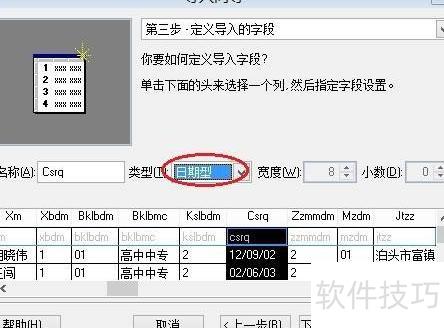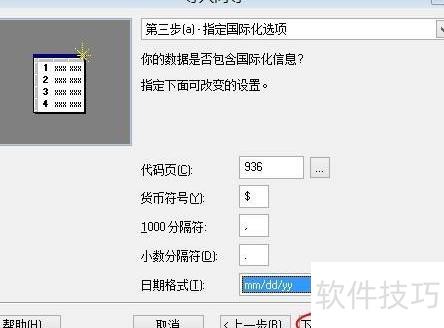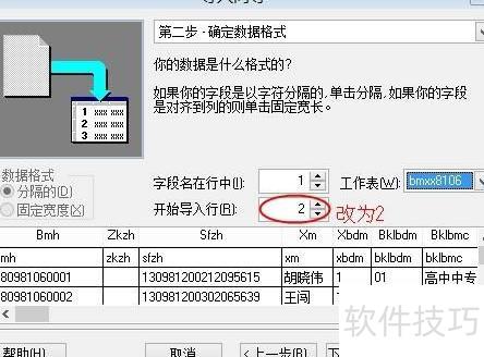 4、 点击下一步,将导入起始行设为2,继续操作;若文件包含日期,请将对应列调整为日期格式。