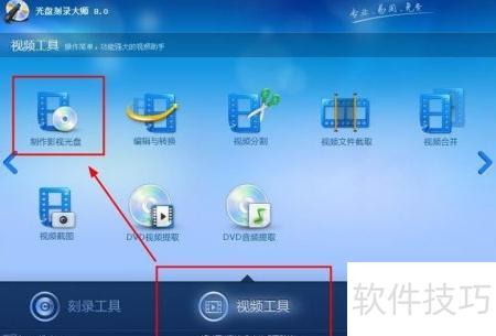 4、 打开软件后进入视频工具选项,其中包含VCD与DVD刻录功能,接着选择制作影视光盘,按提示点击下一步即可继续操作。