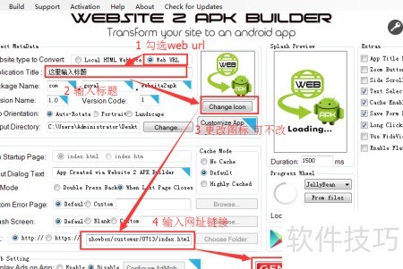 3、 启动Website 2 APK Builder Pro,按照图示步骤进行操作即可。