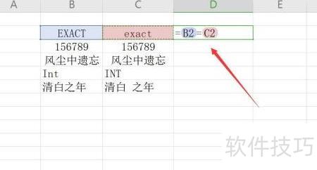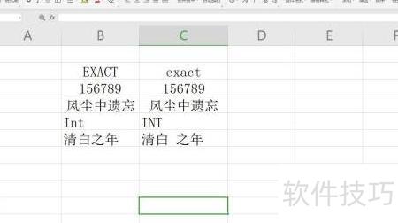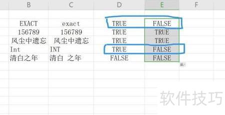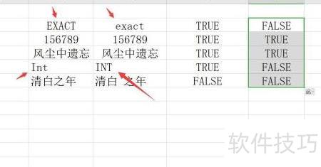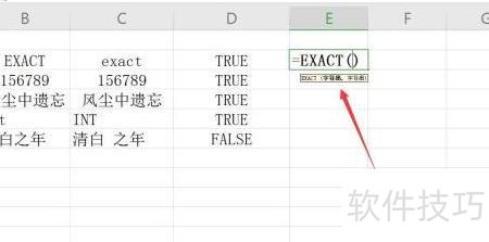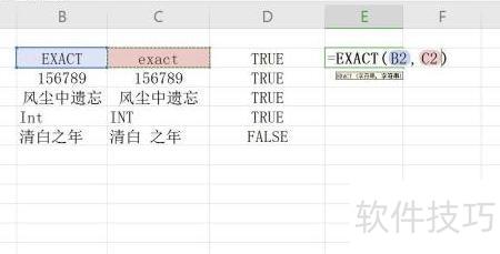 8、 在单元格输入=EXACT函数,可判断两个文本内容是否完全一致。