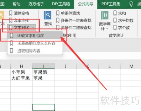 3、 进入公式向导选项卡,在文本模块中选择文本对比,随后下拉菜单展开,点击其中的比较文本相似度功能即可。
