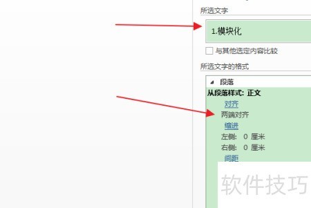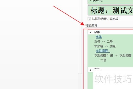 8、 显示格式窗格下方将呈现格式差异,即两段选定文本在文本格式上的对比结果。