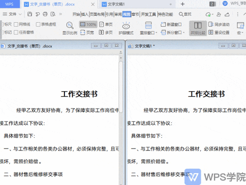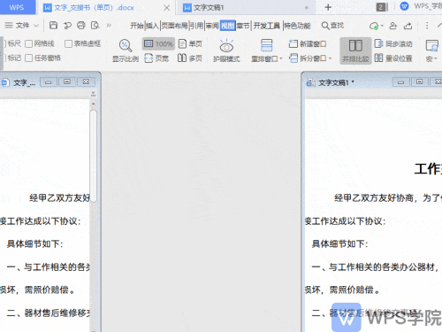 2、 点击菜单栏的并排查看,可使两个文档并列显示,还可通过点击同步滚动按钮开启同步滚动功能。
