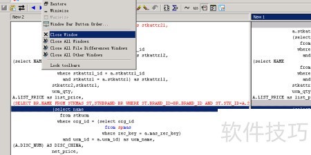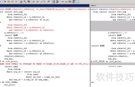 3、 在对比窗口中,两段SQL的差异部分将以红色突出显示。