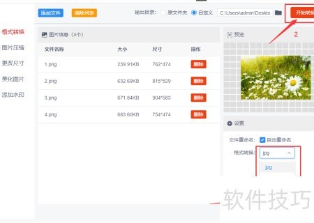 3、 添加文件后,在软件右下方的设置中,通过下拉框选择目标图片格式,随后点击上方开始转换按钮,即可启动批量图片格式转换操作。