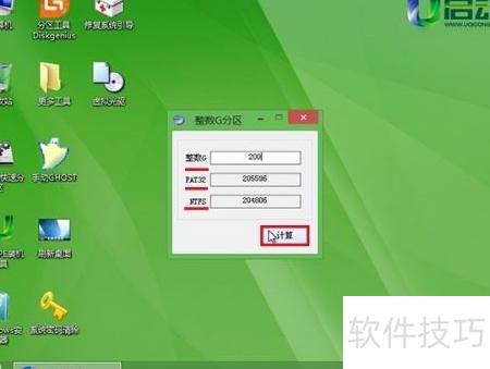 3、 在弹出的工具窗口中,可以看到整数G、FAT32和NTFS选项。在整数G后面的输入框中填入一个数值,然后点击计算按钮,FAT32和NTFS对应的换算结果便会立即显示出来,具体效果所示。