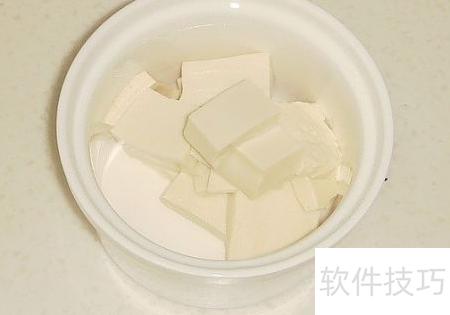 3、 将豆腐切块,均匀铺在碗底。