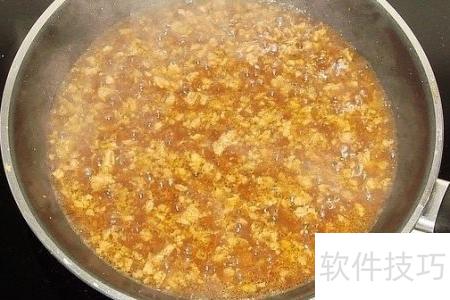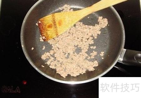 5、 将瘦肉剁成馅,热锅凉油下锅翻炒,直至肉末变色即可。