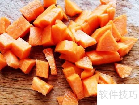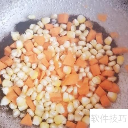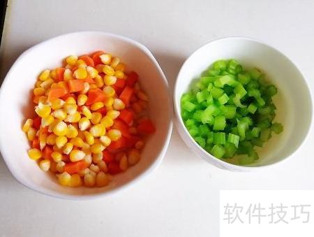 1、 将胡萝卜去皮切粒,芹菜切丁,玉米剥粒备用。
