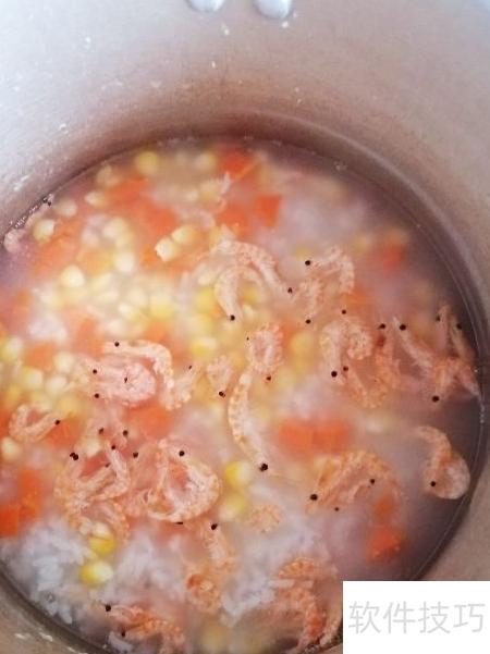 4、 大火煮沸后转小火炖15分钟,加入胡萝卜、虾皮和玉米搅拌均匀。