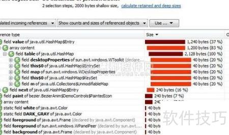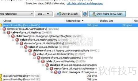 12、 定位内存泄漏的关键工具是堆遍历器中的引用图功能。通过逐层展开对象的传入引用,有时能直接发现异常的引用链。然而,在结构复杂的系统中,仅靠这种方式往往难以奏效。此时,必须追溯一个或多个垃圾回收根节点(garbage collector roots)。这些根节点是JVM中不受垃圾回收机制影响的特殊对象,它们作为可达性分析的起点,维持着对其他对象的引用。一旦某个对象仍被根节点间接引用,就无法被回收。当在引用图中选中特定对象时,界面顶部的相关操作按钮将自动激活,便于进一步分析其引用来源和路径,从而帮助识别导致内存无法释放的根本原因。