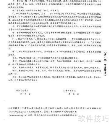 6、 各方须严格遵守协议,单方擅自解除需承担违约责任。就业协议书一式三份,由学校、用人单位及学生各自保存一份。