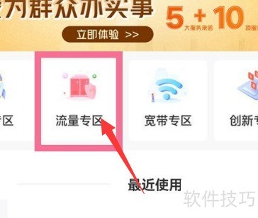 1、 进入服务页面,点击流量专区即可。