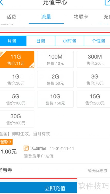 4、 进入页面后选择所需流量包,点击充值即可完成操作。