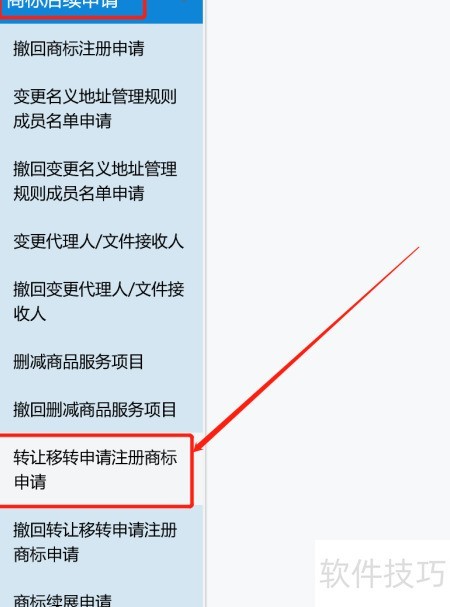 4、 登录系统,进入商标后续业务列表,选取转让转移申请注册商标选项进行操作。