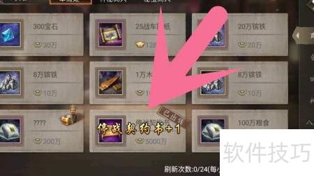 在攻城掠地这款策略游戏中,若想使用停战契约书,需前往军需处进行刷新获取。