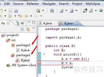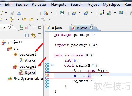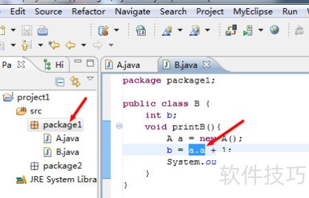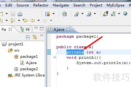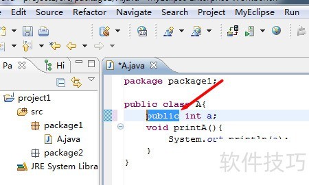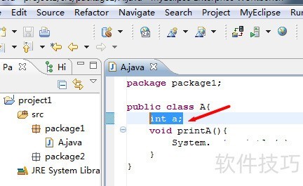 7、 接着讨论默认访问权限(包权限),所示,仍为package1中A类的成员变量a,此次不添加任何修饰符。