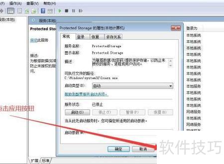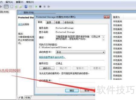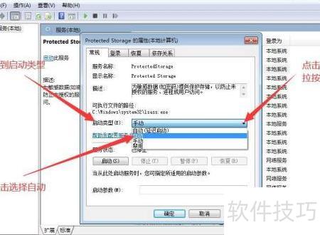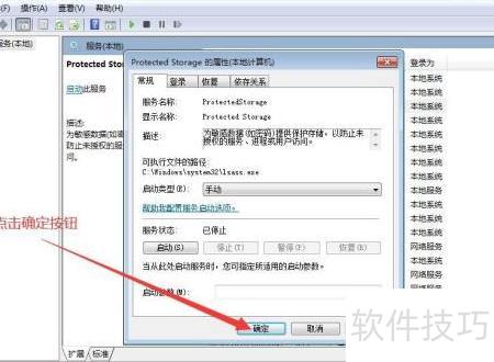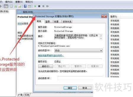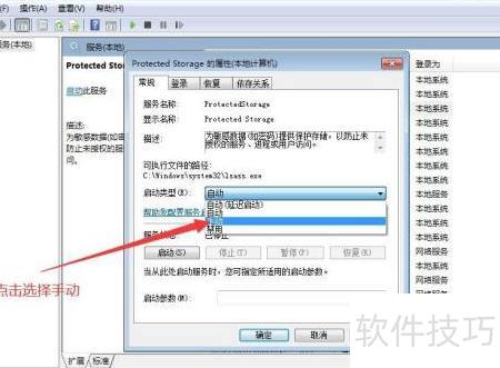 7、 若需将Protected Storage服务设为手动启动,在执行至第五步时,从下拉菜单中选择手动选项,随后继续完成第六步操作。整个过程完成后,即成功更改该服务的启动类型为手动,实现对Protected Storage服务启动方式的设置。