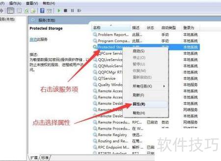 4、 此时,若需将受保护的存储服务设为自动启动,可右键点击该服务项目,在弹出的菜单中选择属性,进入本地计算机上受保护存储服务的属性设置界面。