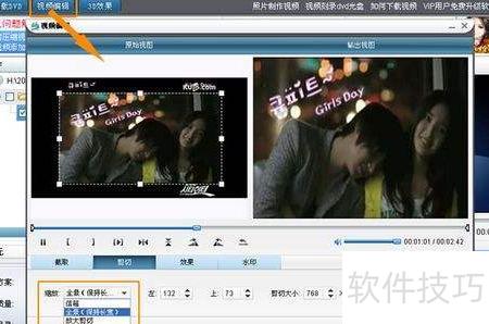 7、 从图中可见,视频画面偏小,四周黑边明显,且带有文字。可点击软件左上角第二个视频编辑按钮进入设置界面。选择剪切功能,将缩放模式设为全景(保持原比例),随后用鼠标拖动左侧预览窗口中的虚线框调整画面位置,右侧窗口可实时查看效果。确认无误后保存设置并返回主界面即可完成操作。