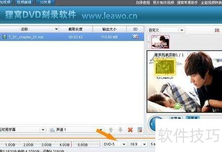 28、 在主界面下方设置DVD刻录参数,包括选择D5或D9光盘类型、视频播放的宽高比以及视频比特率。比特率直接影响画质与文件大小,数值越高,画质越清晰,但文件体积也越大;反之,数值越低,画质相对下降,文件更小。