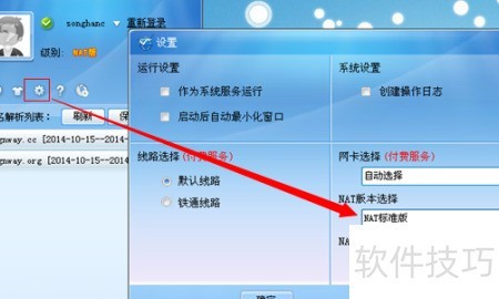 7、 登录客户端后,点击设置按钮,在弹出的对话框中选择NAT版本,切换至NAT移动版,确认后重新登录即可完成切换。