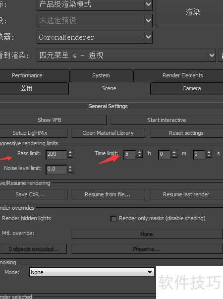 3、 在渲染设置中可设定停止条件,如渲染次数、时间或噪点...