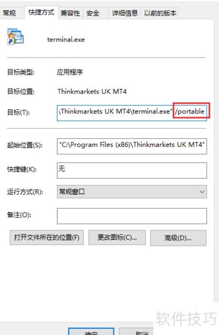 7、 只需为MT4主程序(Terminal.exe)创建快捷方式,并在快捷方式属性的目标路径末尾添加 /portable,即可实现便携运行。具体操作步骤如下: