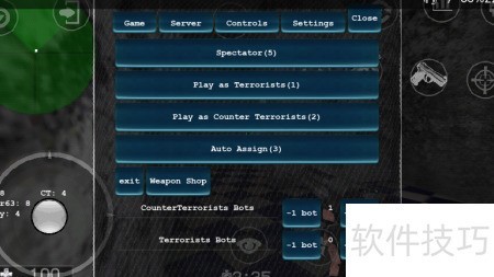 4、 进入游戏后,点击左上角菜单,在弹出界面中选择右下角+1bot按钮,将机器人加入警察或匪徒队伍,玩家可自由选择担任观察者、警察或匪徒角色。