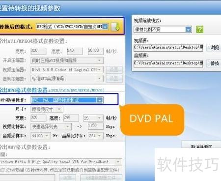 5、 将WMV格式文件导入后,进入操作界面,在底部的MPG质量标准中选择DVD PAL国际标准制式。此时导出的视频即为适用于刻录DVD光盘的标准格式,文件后缀名为MPG,符合常规DVD播放设备的兼容要求,便于后续的光盘制作与播放使用。
