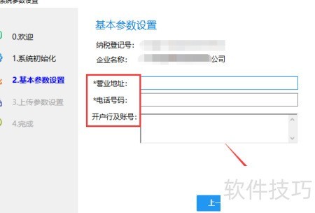 7、 进入参数设置页面,填写公司地址、电话、开户行和账号后,点击下一步继续操作。