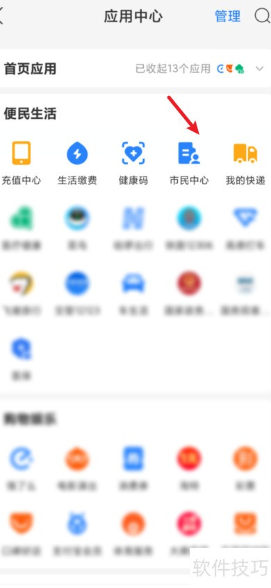 1、 打开支付宝,按图示进入市民中心即可。
