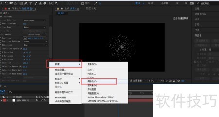 8、 此时在ae合成窗口中无法看到粒子呈圆盘状分布,需在图层面板空白处右键点击,从菜单中选择新建,然后创建摄像机以调整视角。