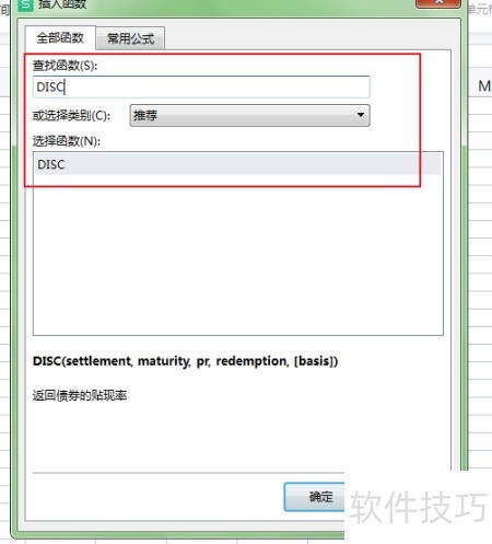 2、 输入查找函数DISC,选中后点击确定即可。
